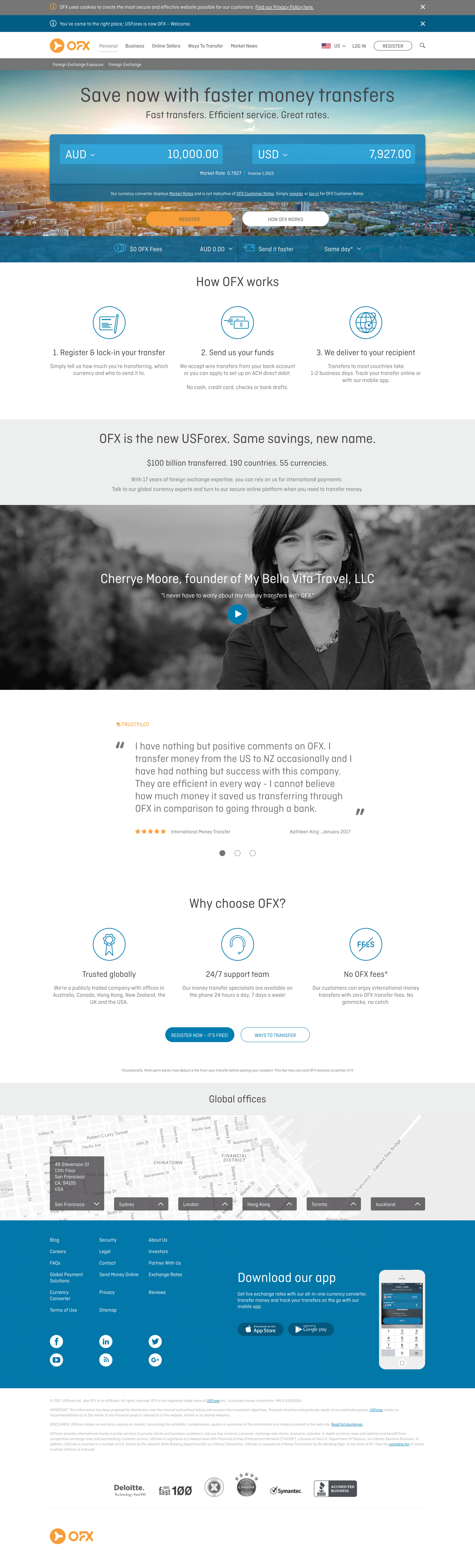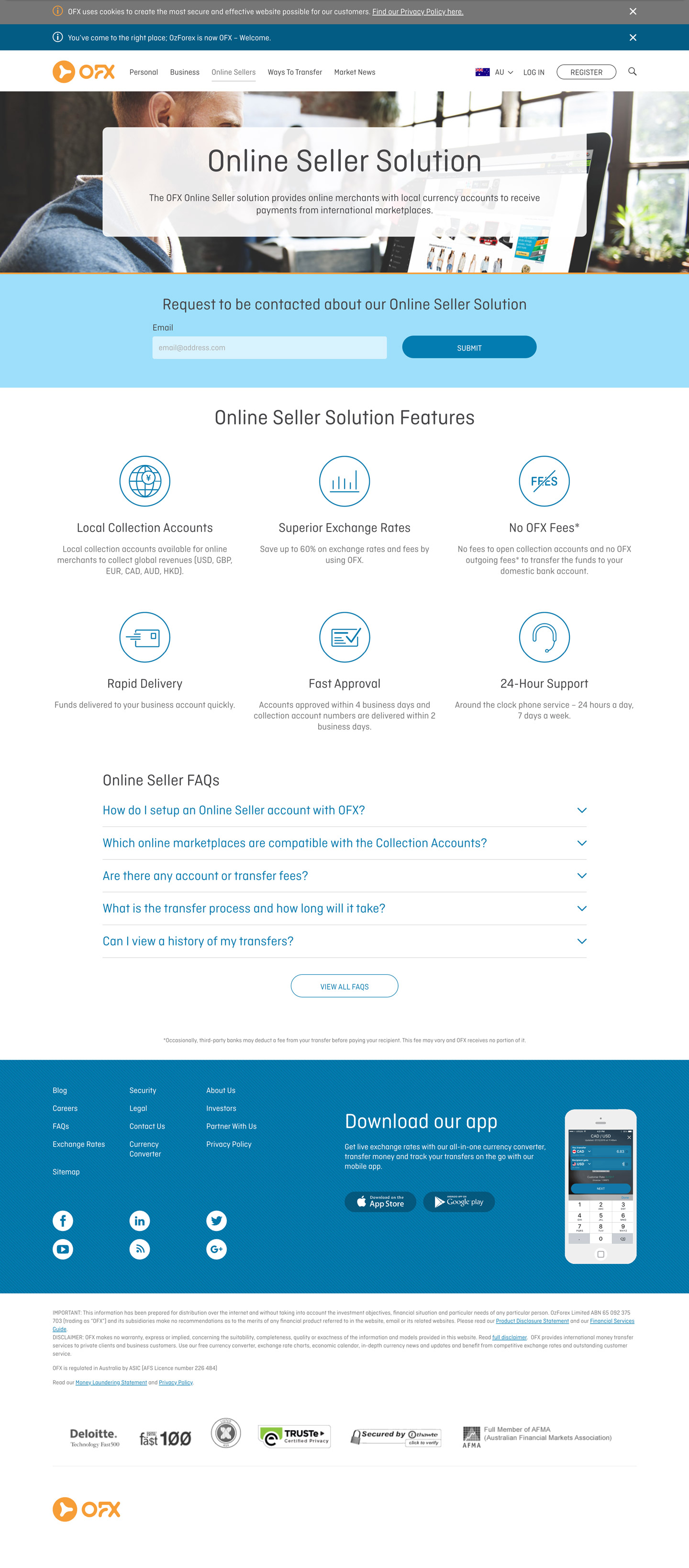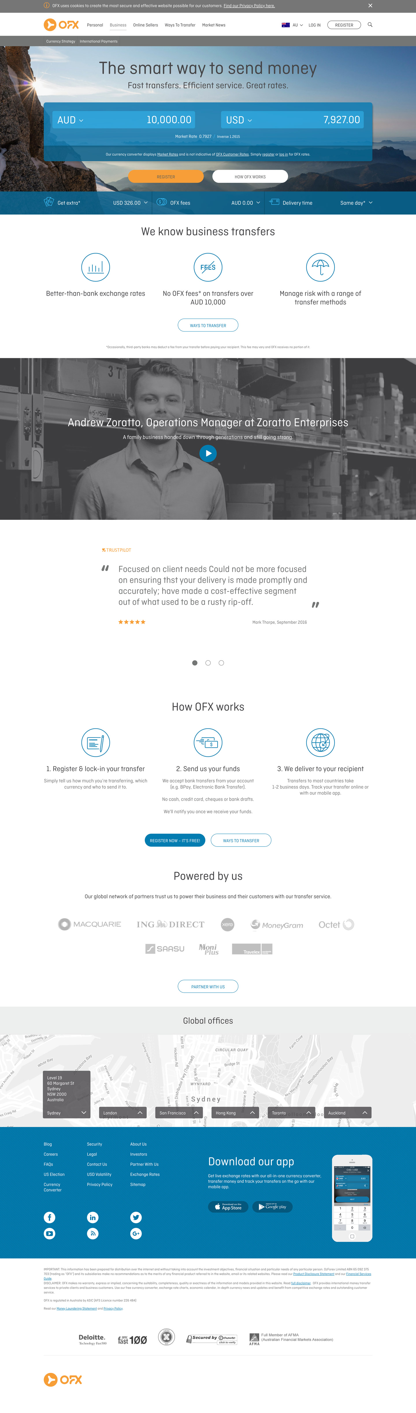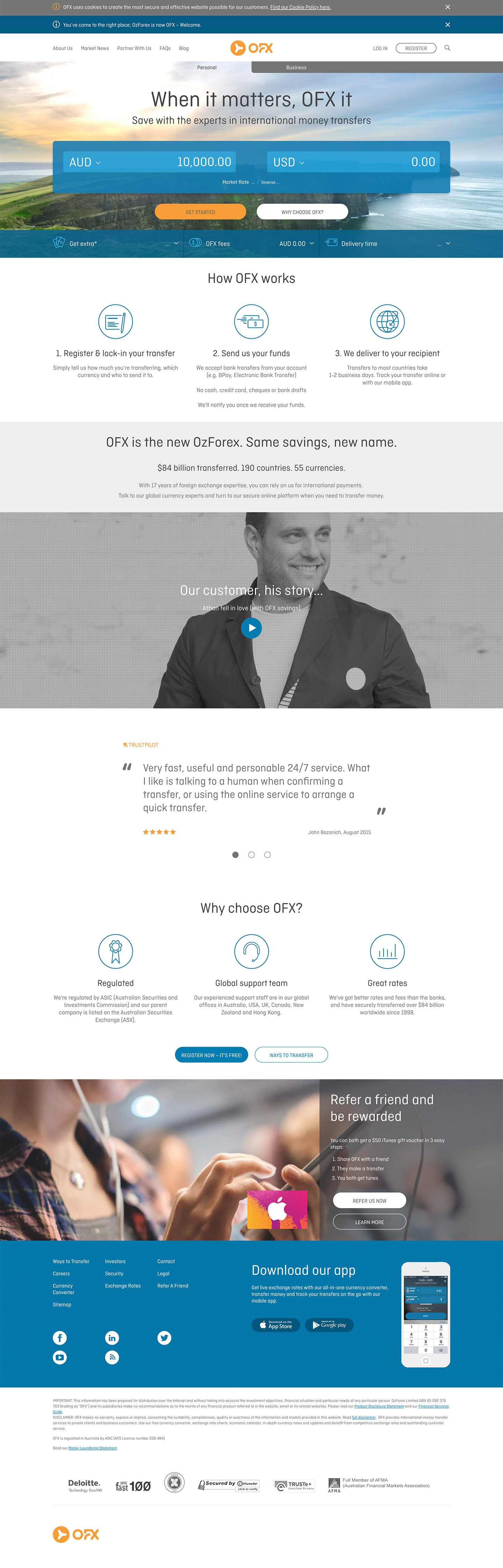 As the brand custodian and the one responsible for the visual transition from their main brand OzForex plus sister companies NZForex, USForex, CanadianForex to OFX, my role on this job was to liaise with the studio in charge of the development and make sure everything on the website was aligned with the new brand I had overseen the creation of.